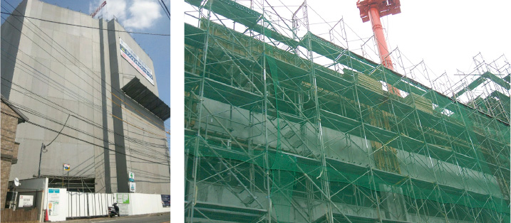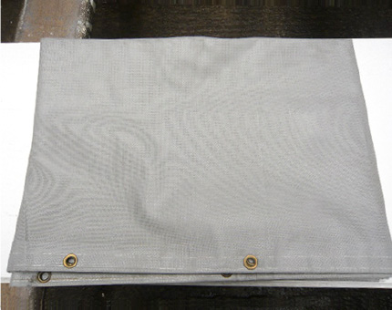 ボウエンメッシュは高強力ポリエステル系に塩化ビニル樹脂で被覆加工したメッシュシートです。主に建築工事現場で足場等の仮設構造物の外側構面に設け、飛来落下物が建築工事現場の外側へ飛び出すことを防止するために使用します。